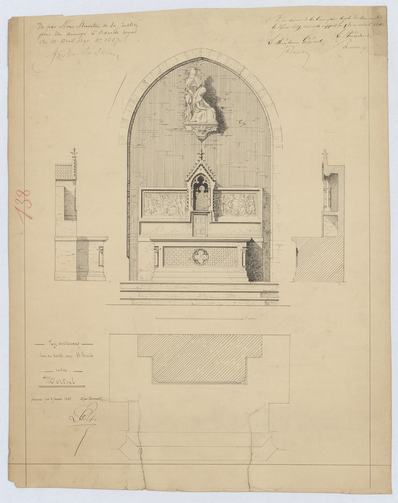 Opschrift: Zij autaren van de kerk van H. Kruis onder Mortsel. Omschrijving plan: plattegrond, voor- en zijaanzicht en dwarsdoorsnede zijaltaar Datum KCML: 2 /02/1889 Archiefnummer: A1064