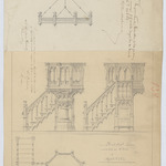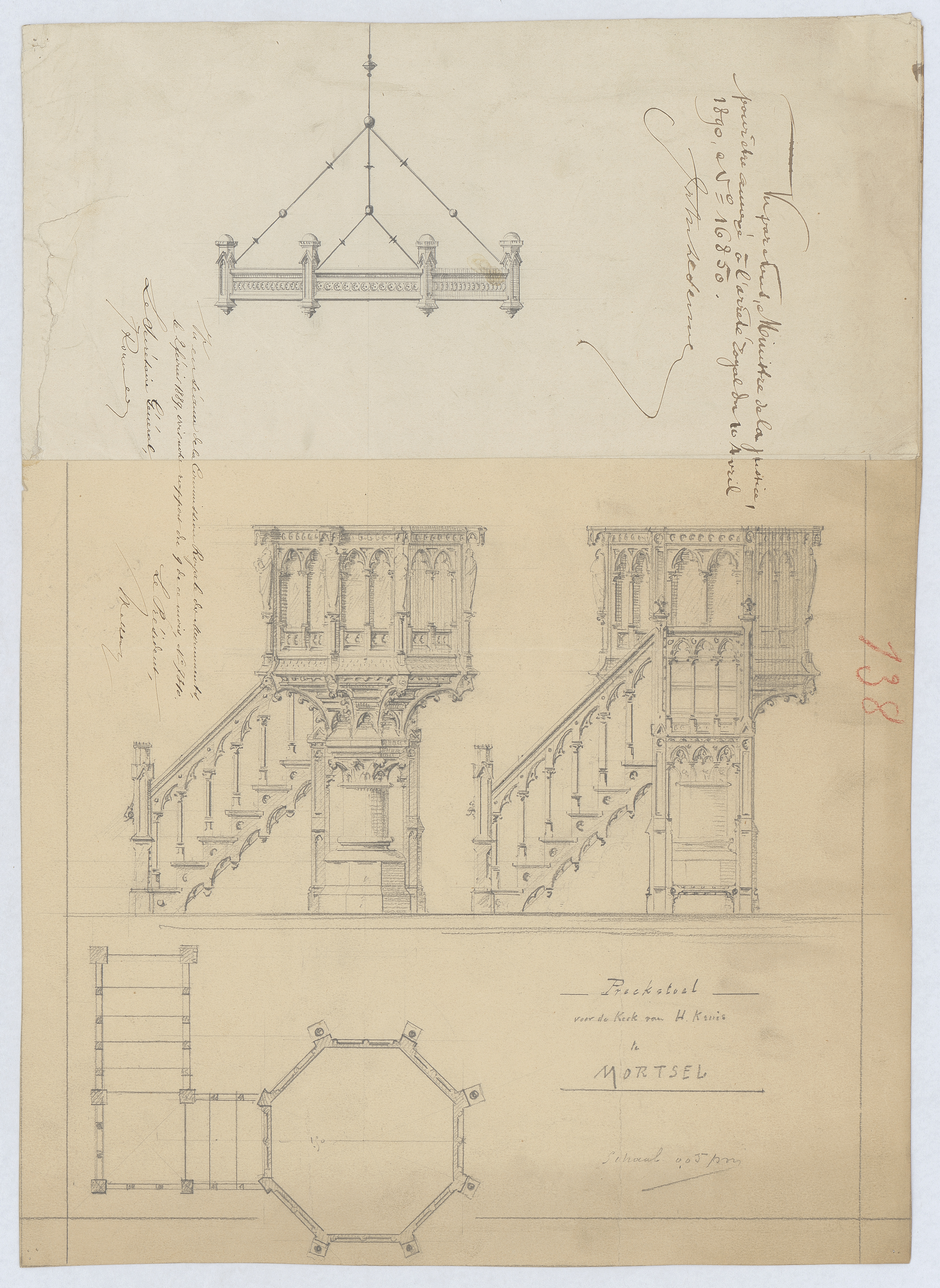 Opschrift: Preekstoel voor de kerk van H. Kruis te Mortsel. Omschrijving plan: plattegrond, voor- en zijaanzicht preekstoel (aangepast ontwerp) Datum KCML: 2 /02/1889 Archiefnummer: A1065_01