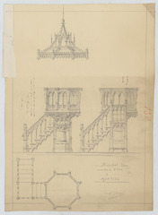 Opschrift: Preekstoel voor de kerk van H. Kruis te Mortsel. Omschrijving plan: plattegrond, voor- en zijaanzicht preekstoel Datum KCML: 2 /02/1889 Archiefnummer: A1065_03