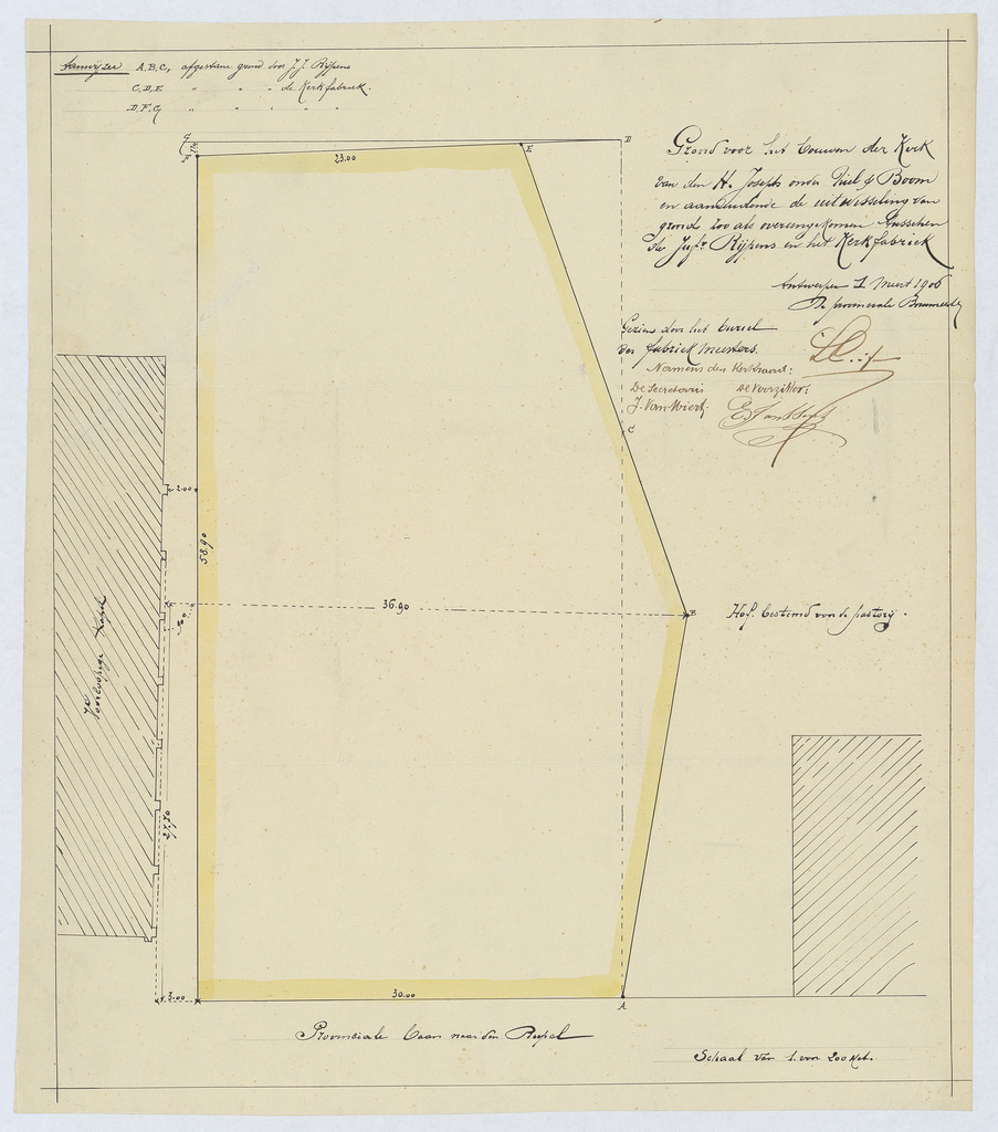 Opschrift: Grond voor het bouwen der Kerk van den H. Josephs onder Niel & Boom en aanduidende de uitwisseling van grond zoals overeengekomen tusschen de Juf. Rijpens en het Kerkfabriek. Omschrijving plan: situatieplan Datum KCML: deze informatie wordt niet vermeld op het archiefstuk Archiefnummer: A1069