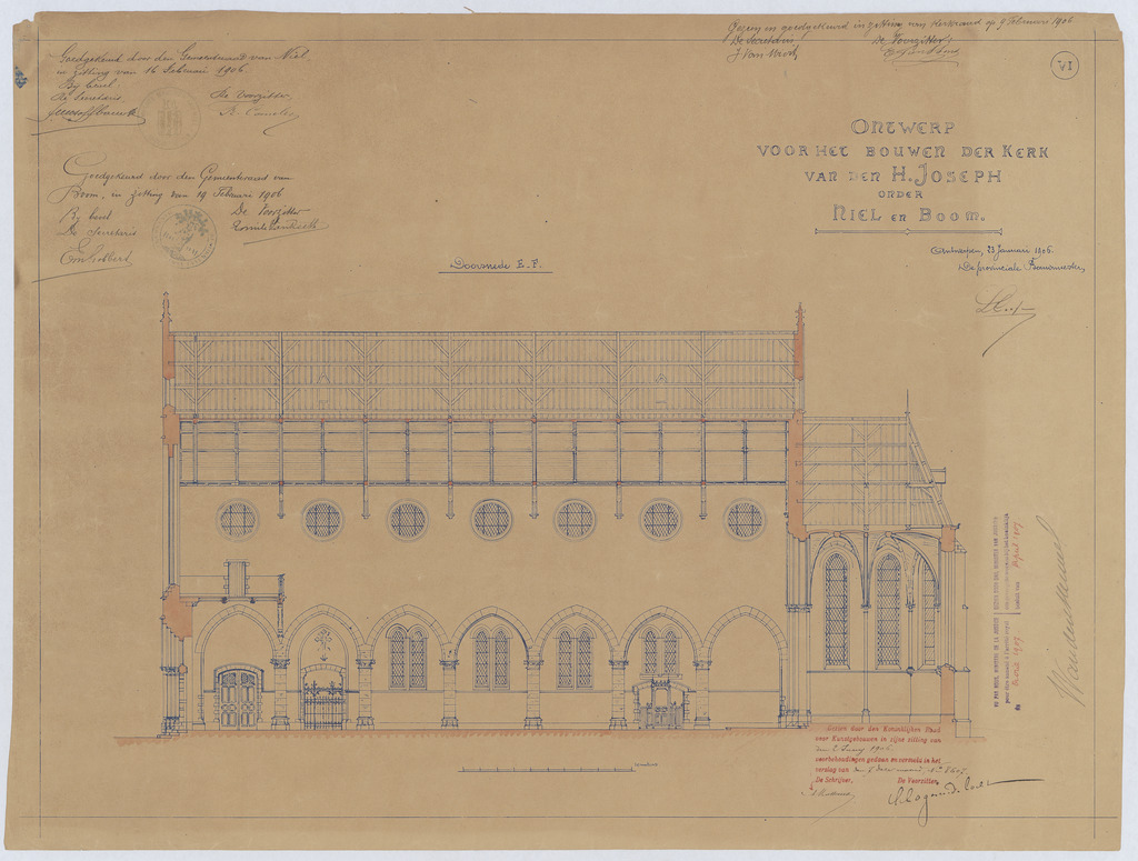 Opschrift: Ontwerp voor het bouwen der kerk van den H. Joseph onder Niel en Boom. Omschrijving plan: langsdoorsnede Datum KCML: 2 /06/1906 Archiefnummer: A1075