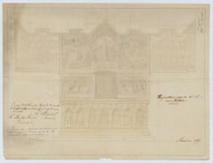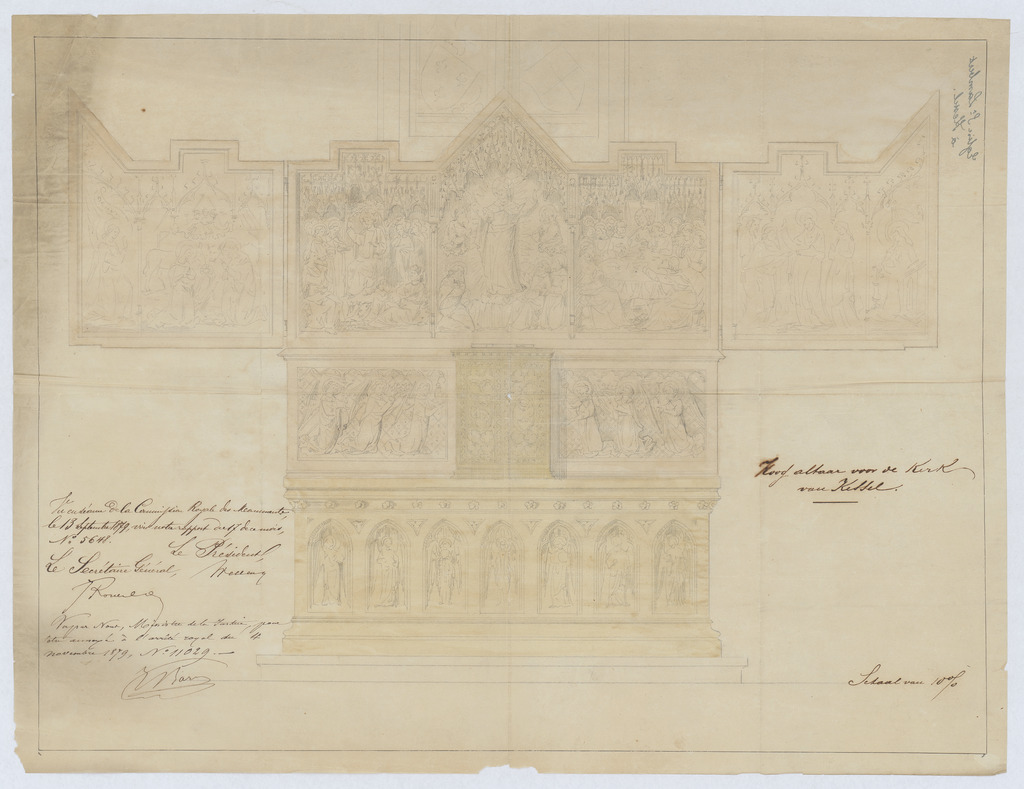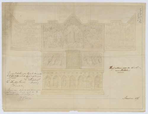 Opschrift: Hoog altaar voor de Kerk van Kessel. Omschrijving plan: vooraanzicht hoofdaltaar Datum KCML: 13/09/1879 Archiefnummer: A1089
