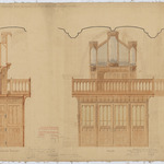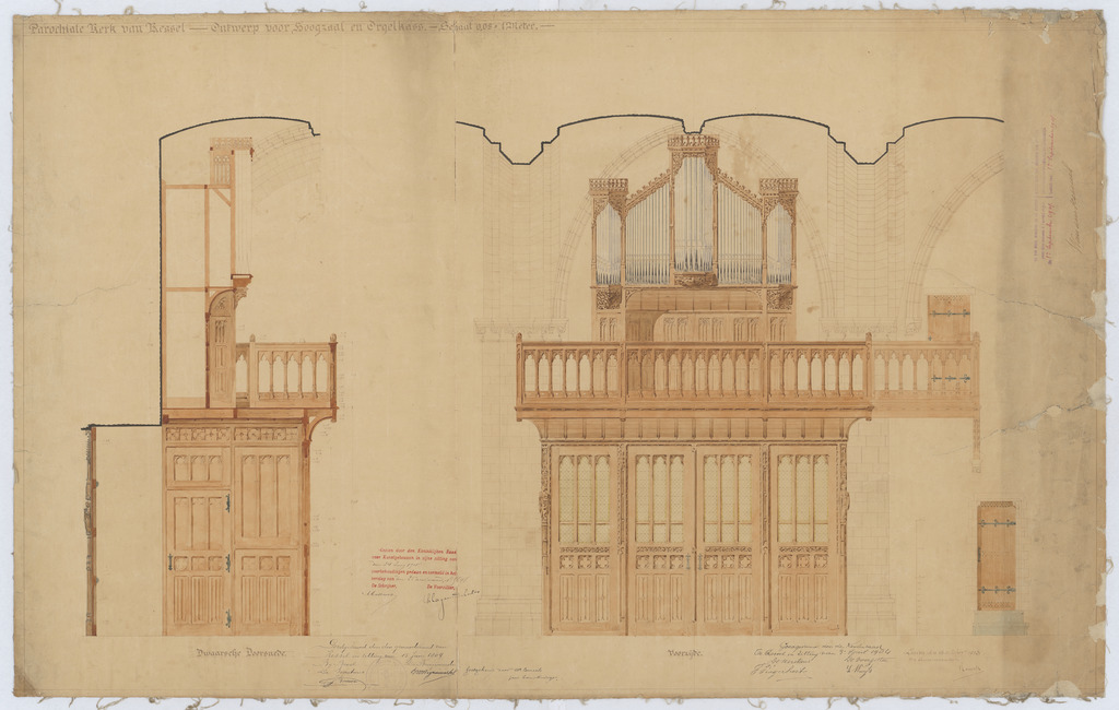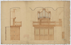 Opschrift: Parochiale Kerk van Kessel - Ontwerp voor Hoogzaal en Orgelkass. Omschrijving plan: vooraanzicht en dwarsdoorsnede doksaal en orgelkast Datum KCML: 24/06/1905 Archiefnummer: A1090