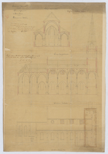 Opschrift: Eglise d' Achter-Oolen. Omschrijving plan: opstand zijgevel 1, langsdoorsnede dwarsdoorsnede Datum KCML: 29/10/1864 Archiefnummer: A1093
