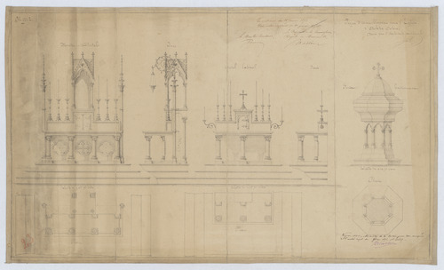 Opschrift: Projet d'ameublement pour l'Eglise d'Achter-Oolen. Omschrijving plan: plattegrond, voor- en zijaanzicht hoofdaltaar, plattegrond, voor- en zijaanzicht zijaltaar, plattegrond en aanzicht doopvont Datum KCML: 28/01/1871 Archiefnummer: A1095