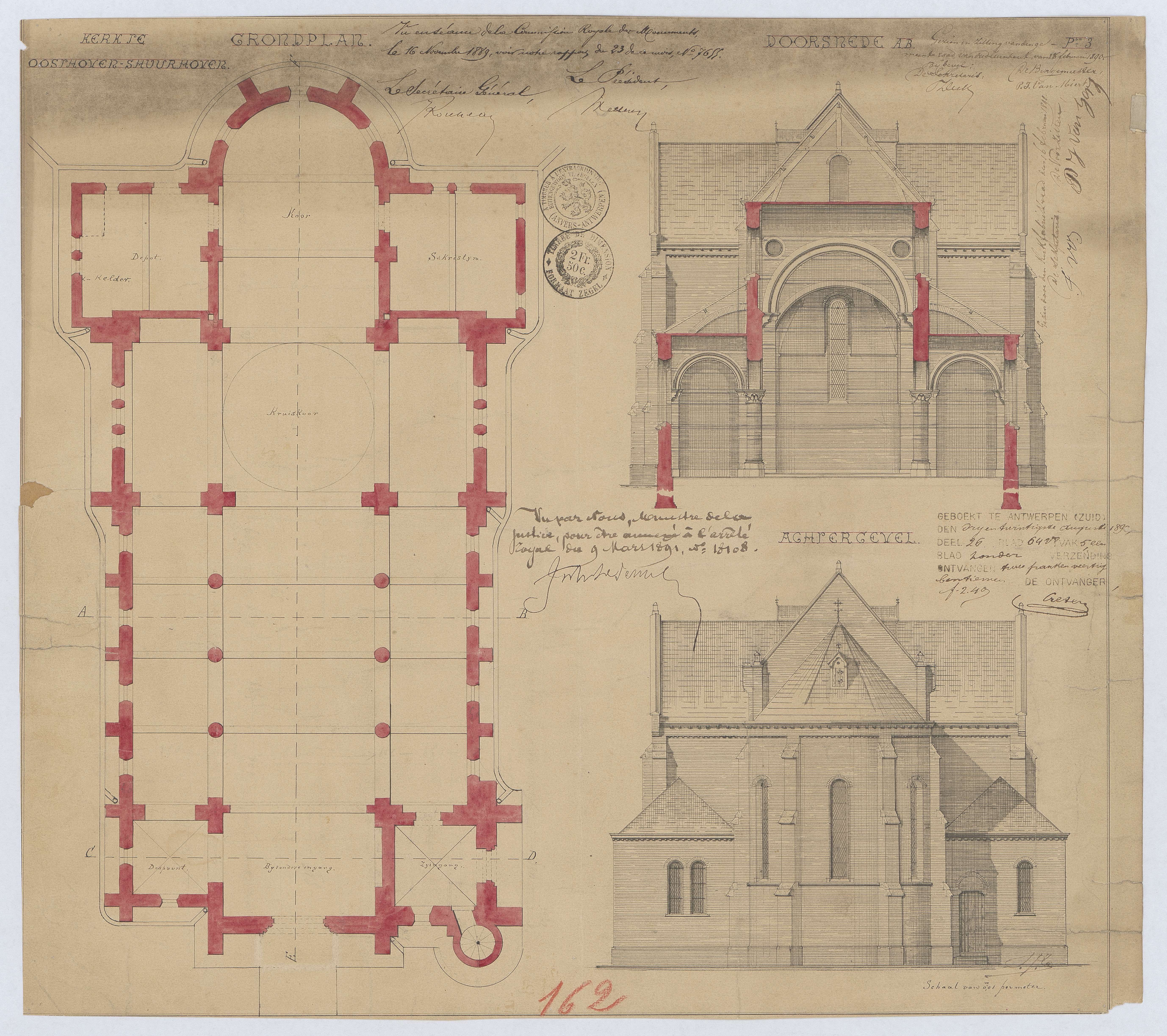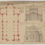 Opschrift: Ontwerp voor het bouwen eener kerk te Oosthoven-Schuurhoven onder Oud-Turnhout. Omschrijving plan: opstand achtergevel, plattegrond niveau 0 dwarsdoorsnede Datum KCML: 16/11/1889 Archiefnummer: A1111