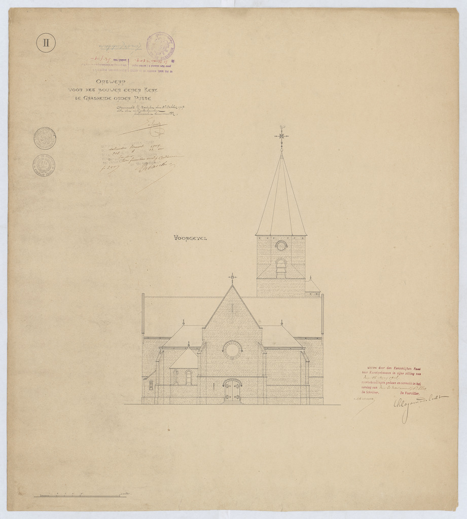 Opschrift: Ontwerp voor het bouwen eener kerk te Grasheide onder Putte. Omschrijving plan: opstand voorgevel Datum KCML: 16/05/1908 Archiefnummer: A1121