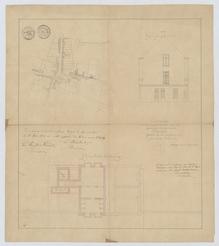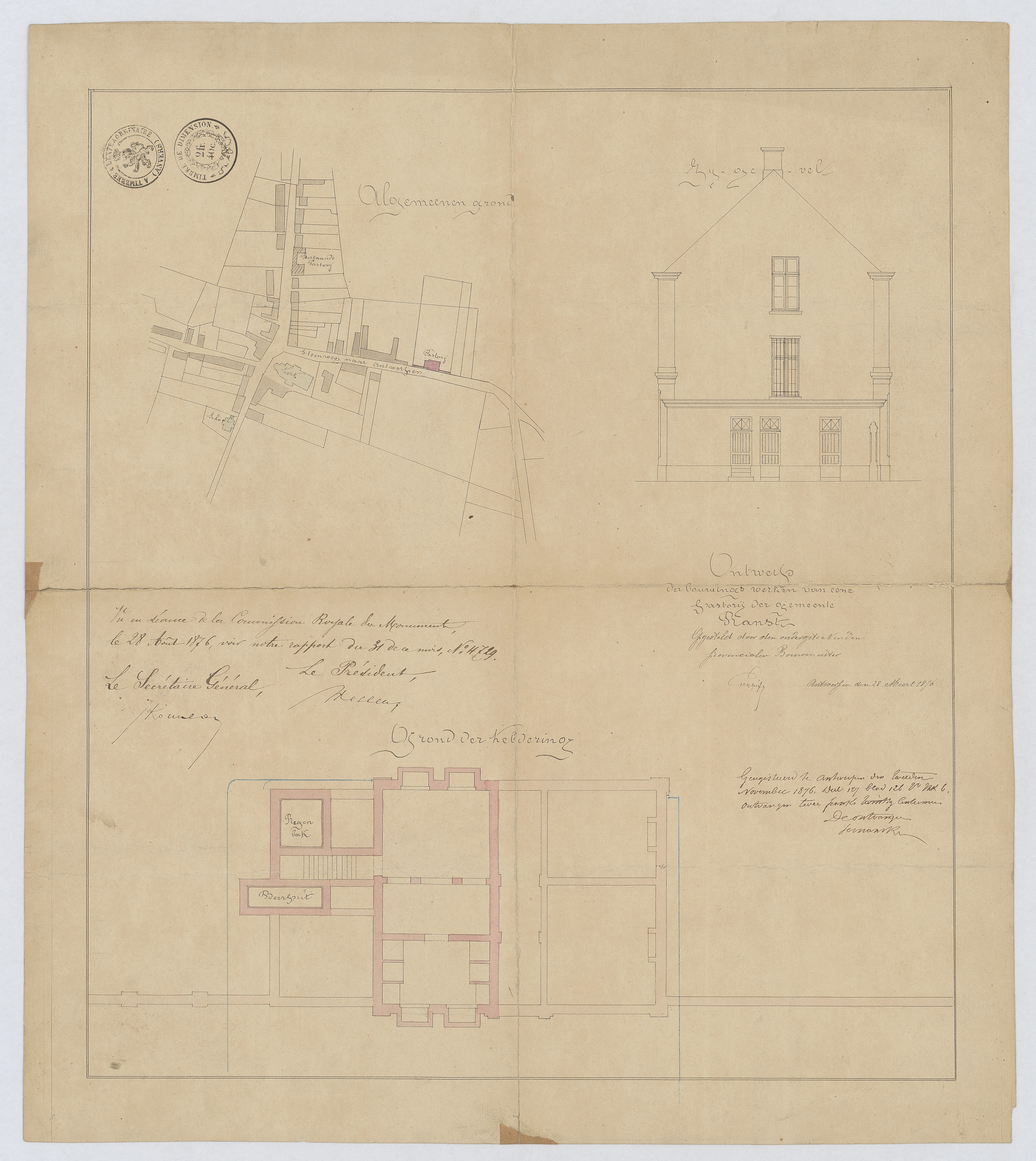 Opschrift: Ontwerp voor het bouwen van eene pastorij in de gemeente Ranst. Omschrijving plan: situatieplan, opstand zijgevel, plattegrond niveau -1 Datum KCML: 22/08/1876 Archiefnummer: A1143