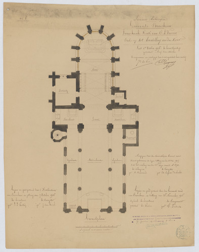 Opschrift: Provincie Antwerpen. Gemeente Broechem. Parochiale kerk van O.L.Vrouw. Ontwerp tot herstelling van den Koor. Omschrijving plan: plattegrond niveau 0 Datum KCML: 18/05/1907 Archiefnummer: A1144