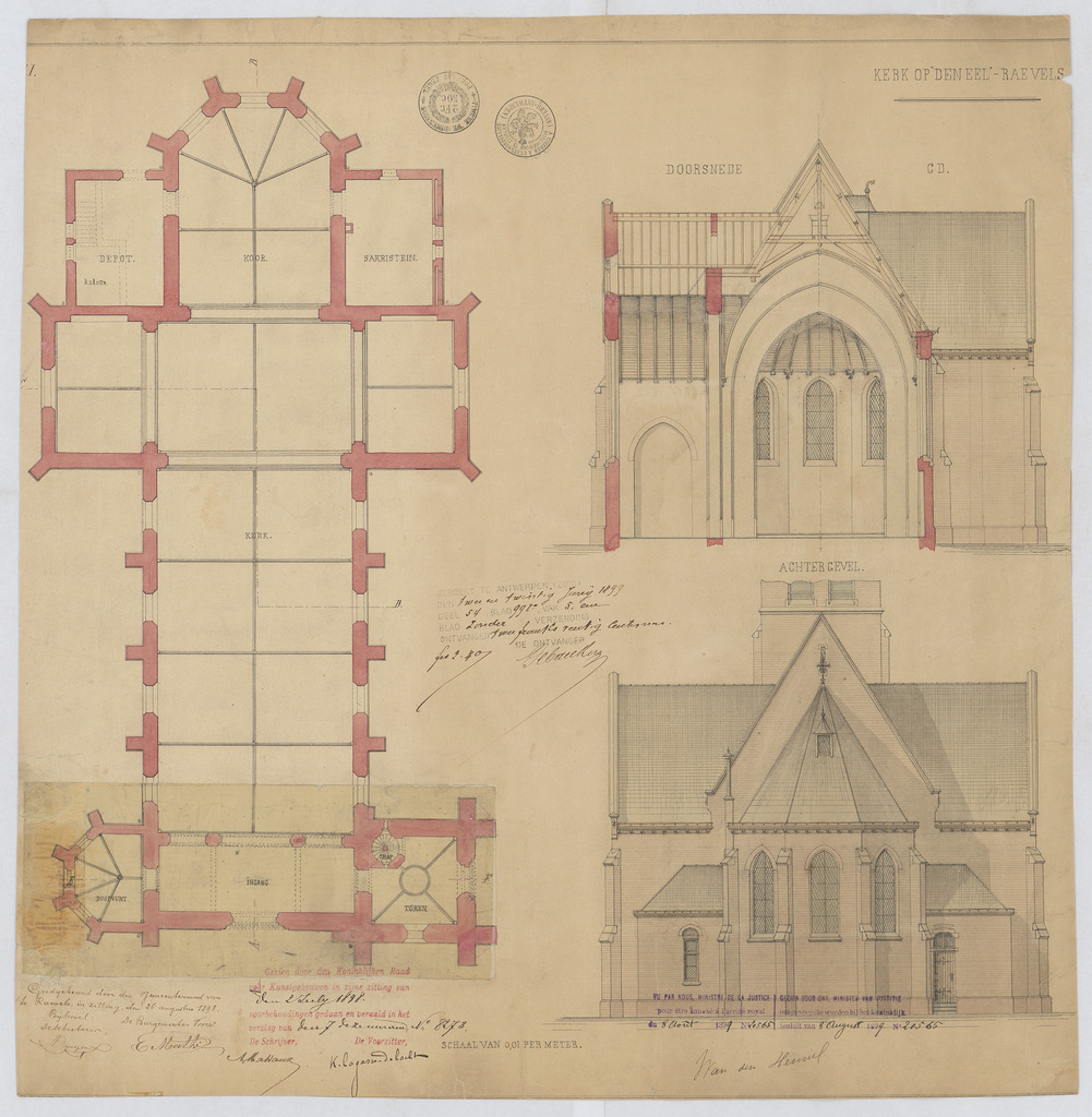 Opschrift: Kerk op 'den Eel' - Raevels. Omschrijving plan: plattegrond niveau 0, opstand achtergevel, dwarsdoorsnede koor Datum KCML: 2 /07/1898 Archiefnummer: A1155