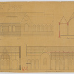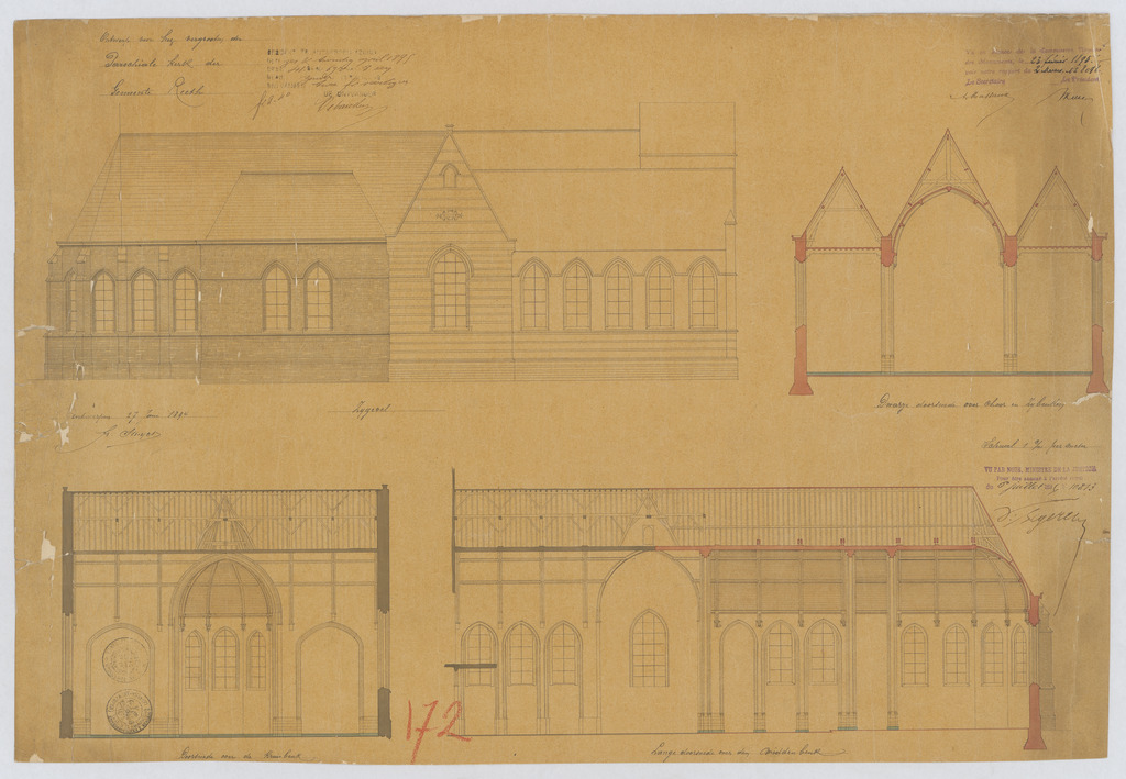 Opschrift: Ontwerp voor het vergrooten der Parochiale Kerk der Gemeente Reeth. Omschrijving plan: opstand Z-gevel, langsdoorsnede, dwarsdoorsnede over koor en zijbeuken, dwarsdoorsnede kruisbeuk Datum KCML: 23/02/1895 Archiefnummer: A1204