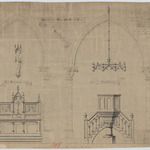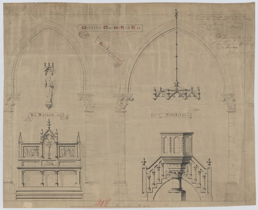 Opschrift: Meubelen voor de Kerk van Terhaegen. Omschrijving plan: aanzicht zijaltaar en preekstoel Datum KCML: 21/02/1885 Archiefnummer: A1214