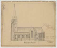 Opschrift: Provincie Antwerpen. Gemeente Poppel. Ontwerp van vergrooting en herstelling der parochiale Kerk. Herstelde staat. Omschrijving plan: opstand Z-gevel Datum KCML: 22/04/1905 Archiefnummer: A1168