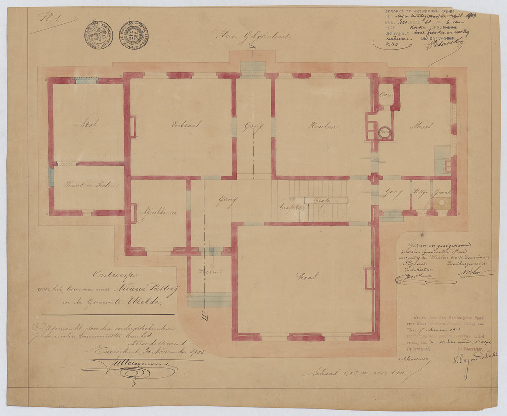 Opschrift: Ontwerp voor het bouwen eener Nieuwe Pastorij in de gemeente Weelde. Omschrijving plan: plattegrond niveau 0 Datum KCML: 7 /03/1903 Archiefnummer: A1174