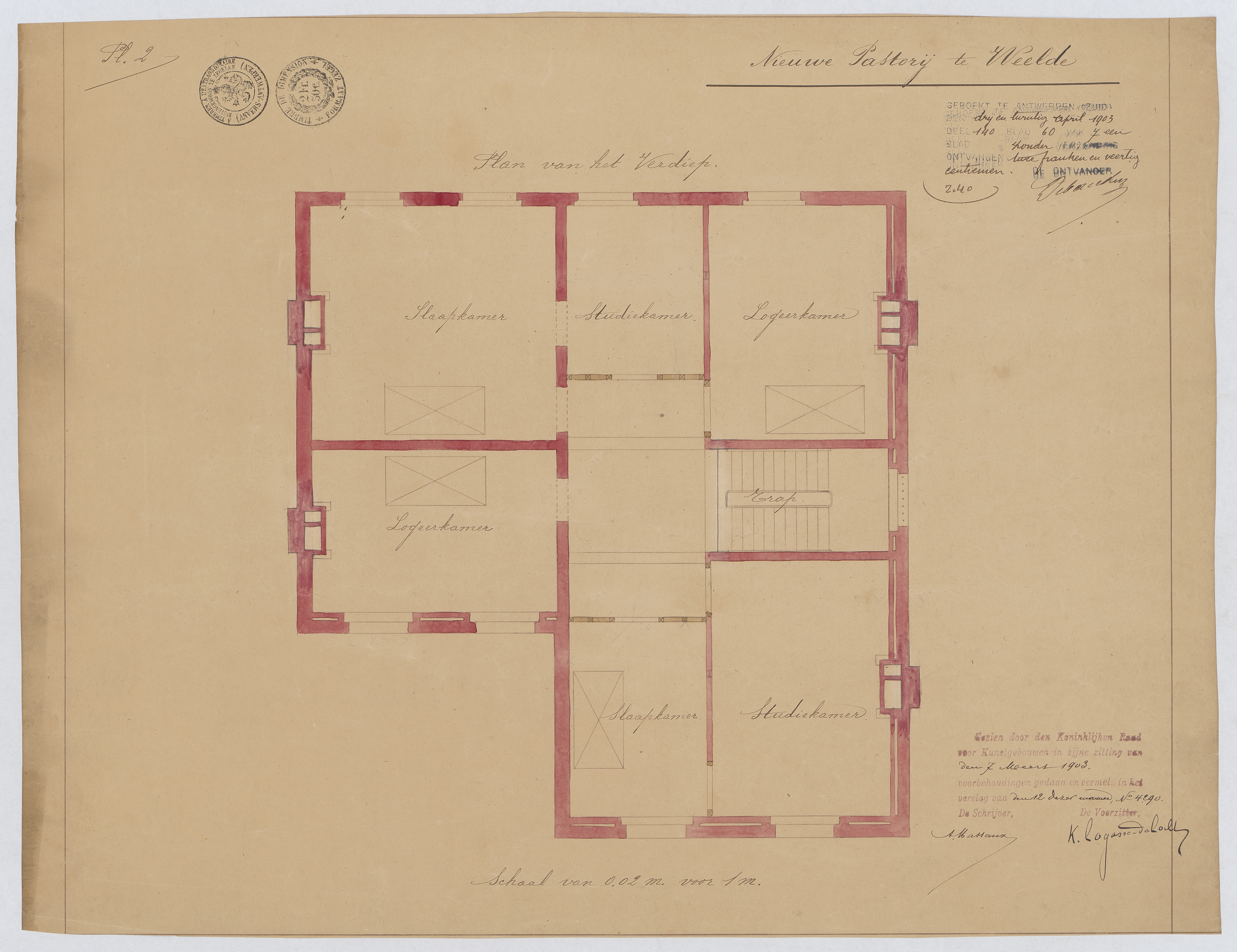 Opschrift: Nieuwe Pastorij te Weelde. Omschrijving plan: plattegrond niveau 1 Datum KCML: 7 /03/1903 Archiefnummer: A1175