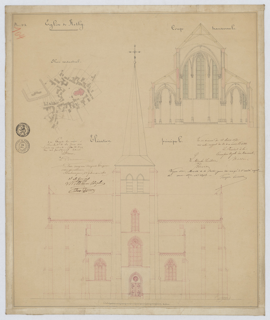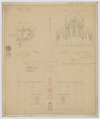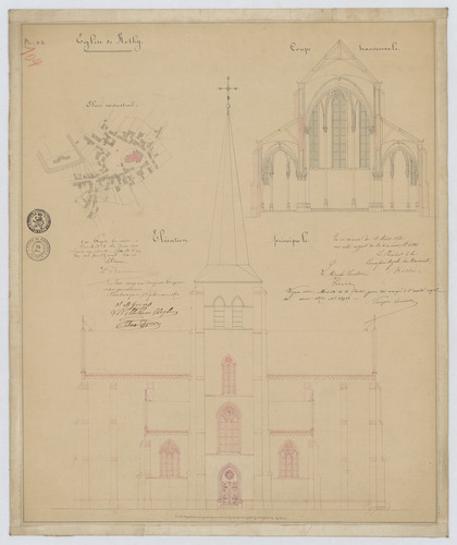 Opschrift: Eglise de Rethy. Omschrijving plan: opstand voorgevel, dwarsdoorsnede, situatieplan Datum KCML: 13/08/1870 Archiefnummer: A1184
