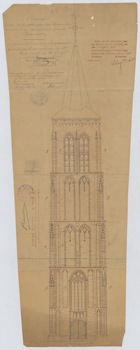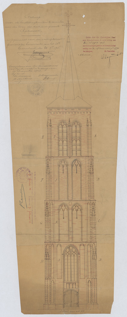 Opschrift: Ontwerp voor de herstellingswerken te verrichten aan den toren der kerk in de gemeente Ryckevorsel. Omschrijving plan: opstand voorgevel, opstand toren Datum KCML: 13/04/1907 Archiefnummer: A1190