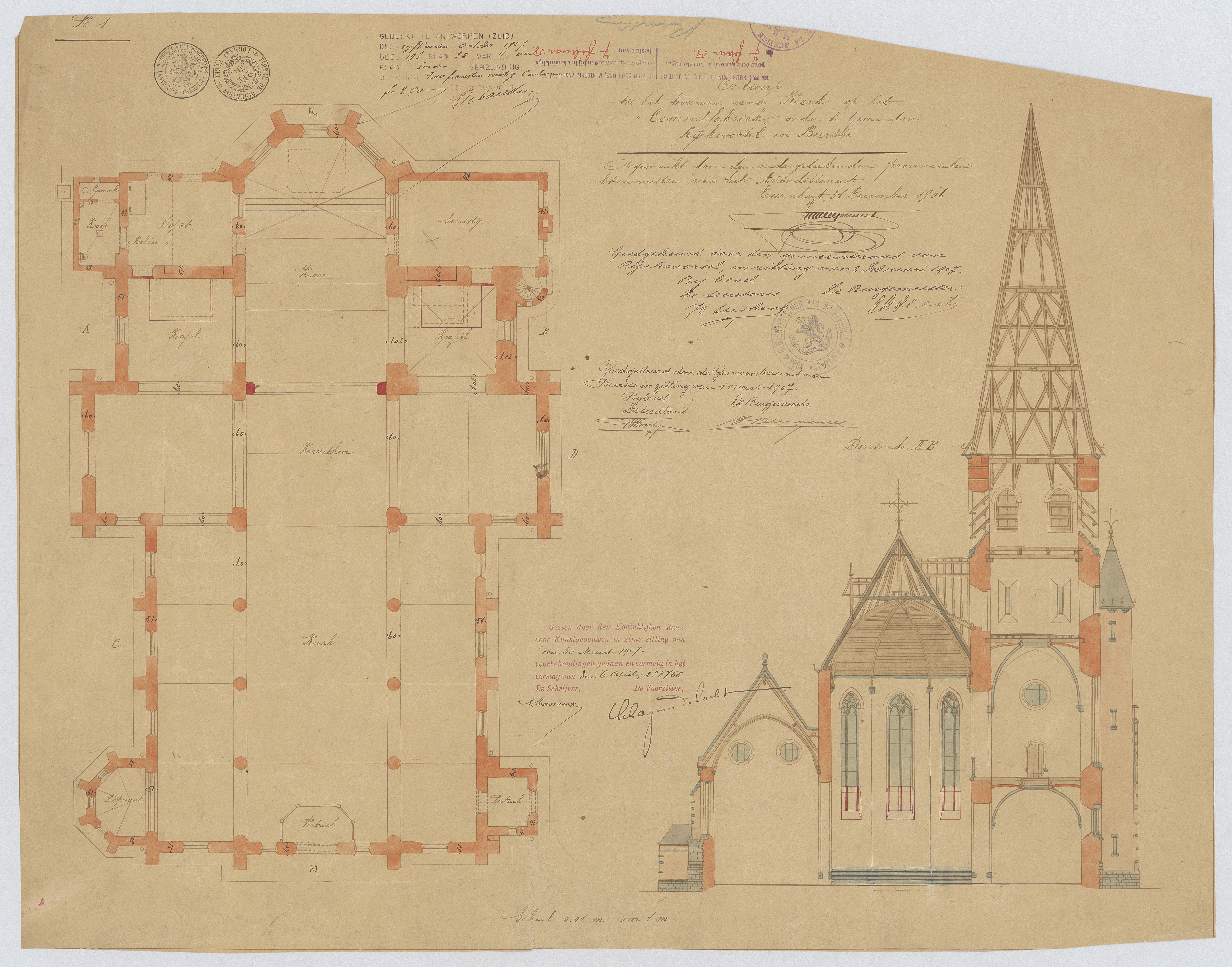 Opschrift: Ontwerp tot het bouwen eener Kerk op het 'Cementfabriek' onder de Gemeenten Ryckevorsel en Beersse. Omschrijving plan: plattegrond niveau 0, dwarsdoorsnede Datum KCML: 30/03/1907 Archiefnummer: A1191