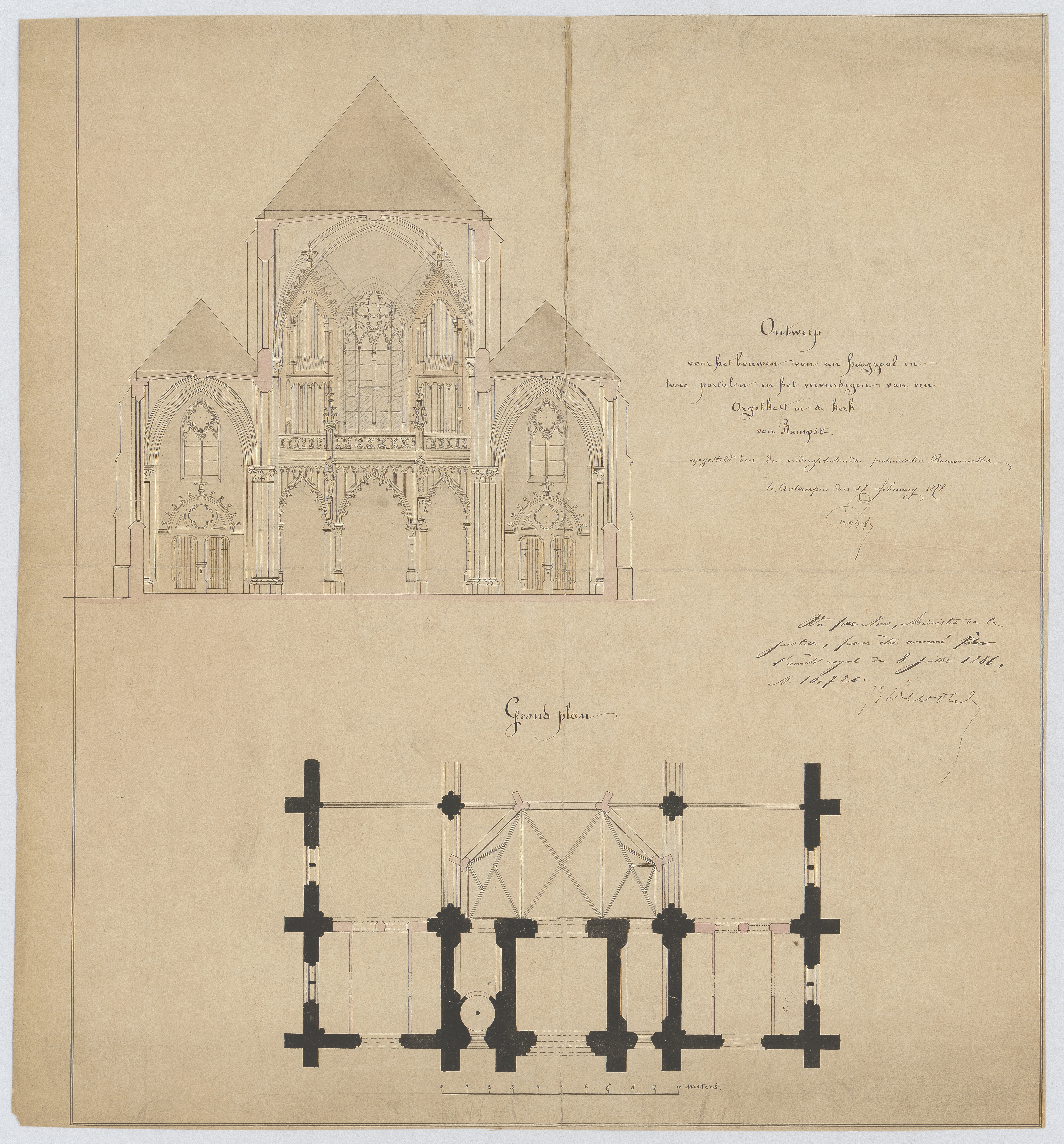 Opschrift: Ontwerp voor het bouwen van een hoogzaal en twee portalen en het verveerdigen van eene orgelkast in de kerk van Rumst. Omschrijving plan: plattegrond en aanzicht doksaal en orgelkast Datum KCML: deze informatie wordt niet vermeld op het archiefstuk Archiefnummer: A1197
