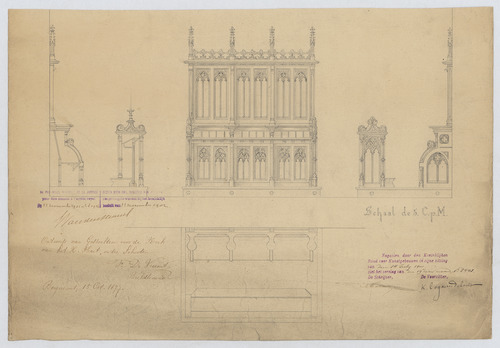 Opschrift: Ontwerp van Gestoelten voor de Kerk van het H. Hart, onder Schooten. Omschrijving plan: plattegrond, doorsnede en voor- en zijaanzicht gestoelte Datum KCML: 14/07/1900 Archiefnummer: A1230