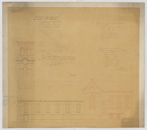 Opschrift: Ontwerp tot het vergrooten der Kerk te St.-Amands. Omschrijving plan: opstand zijgevel 1 Datum KCML: 15/12/1866 Archiefnummer: A1233