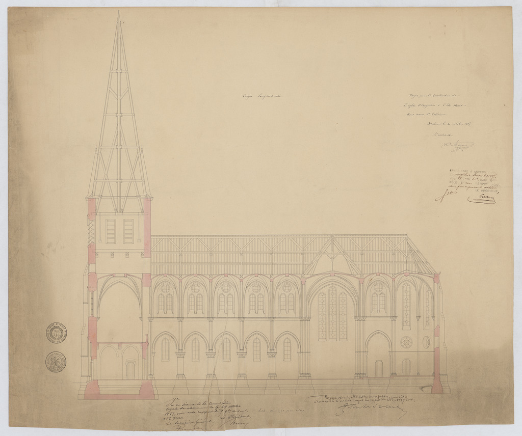 Opschrift: Projet pour la Construction de l'église de St. Augustin à l'elsestraat sous Wavre St. Cathérine. Omschrijving plan: langsdoorsnede Datum KCML: 29/10/1887 Archiefnummer: A1240