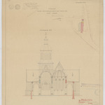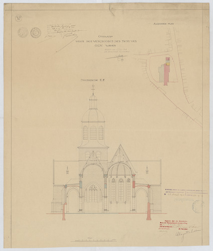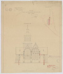 Opschrift: Ontwerp voor het vergrooten der kerk van O.L.V. Waver. Omschrijving plan: dwarsdoorsnede, situatieplan Datum KCML: 3 /10/1908 Archiefnummer: A1251