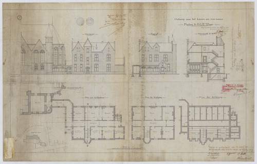 Opschrift: Ontwerp voor het bouwen van eene nieuwe Pastorij te O.L.V. Waver. Omschrijving plan: plattegrond niveau 0, situatieplan, plattegrond niveau -1, plattegrond niveau 1 opstand voorgevel opstand zijgevel dwarsdoorsnede Datum KCML: 31/07/1909 Archiefnummer: A1253