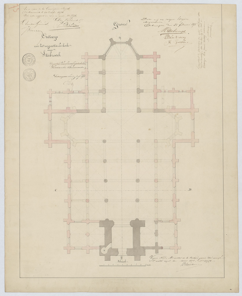 Opschrift: Ontwerp voor het vergrooten der kerk van Stabroek. Omschrijving plan: plattegrond niveau 0 Datum KCML: 24/10/1874 Archiefnummer: A1255
