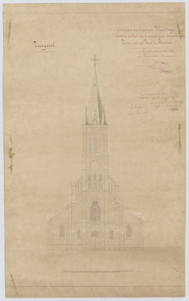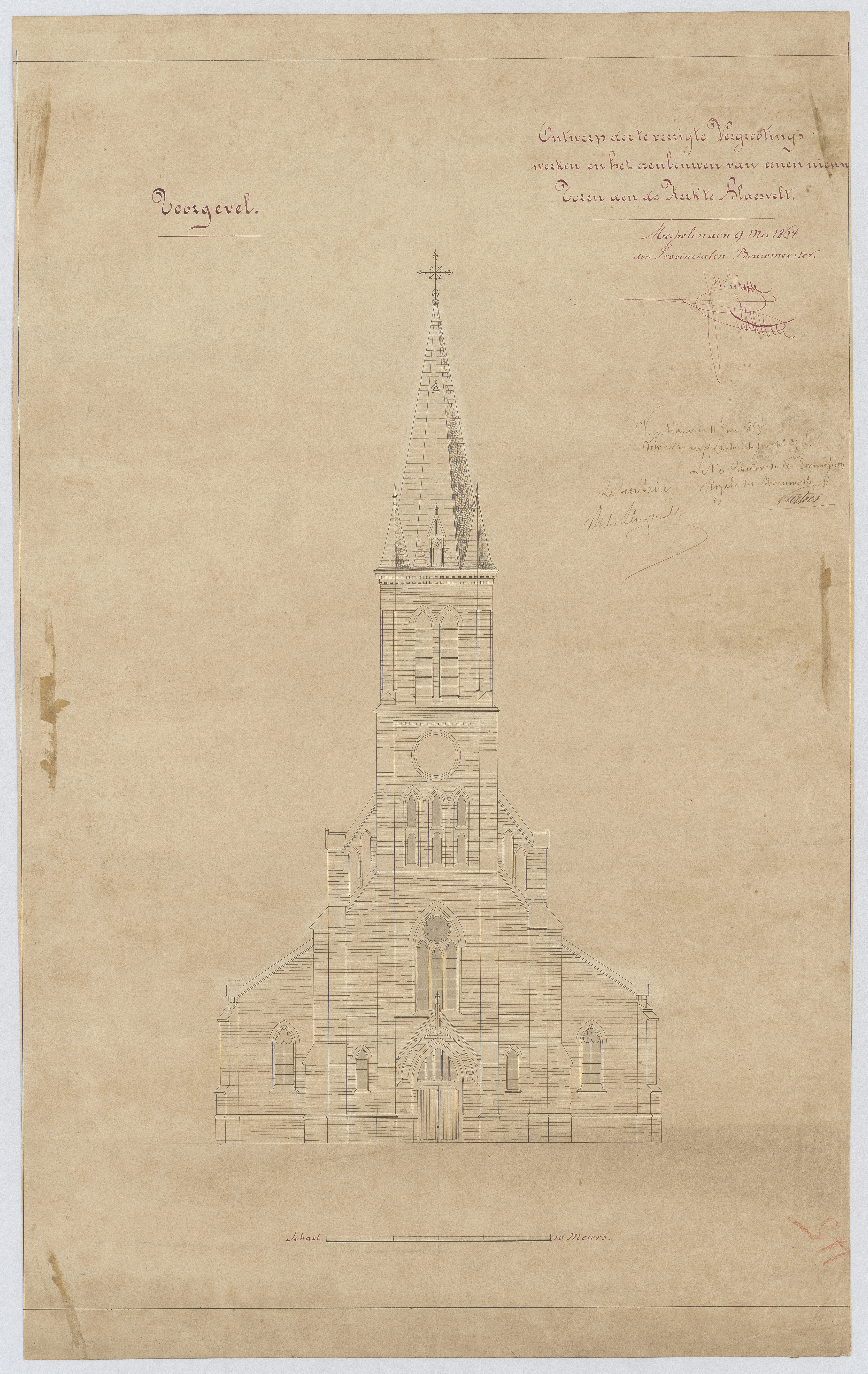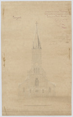 Opschrift: Ontwerp der te verrichte vergrootingswerken en het aenbouwen van eenen nieuwen toren aen de Kerk te Blaesveld. Omschrijving plan: opstand voorgevel Datum KCML: 11/06/1864 Archiefnummer: A1300
