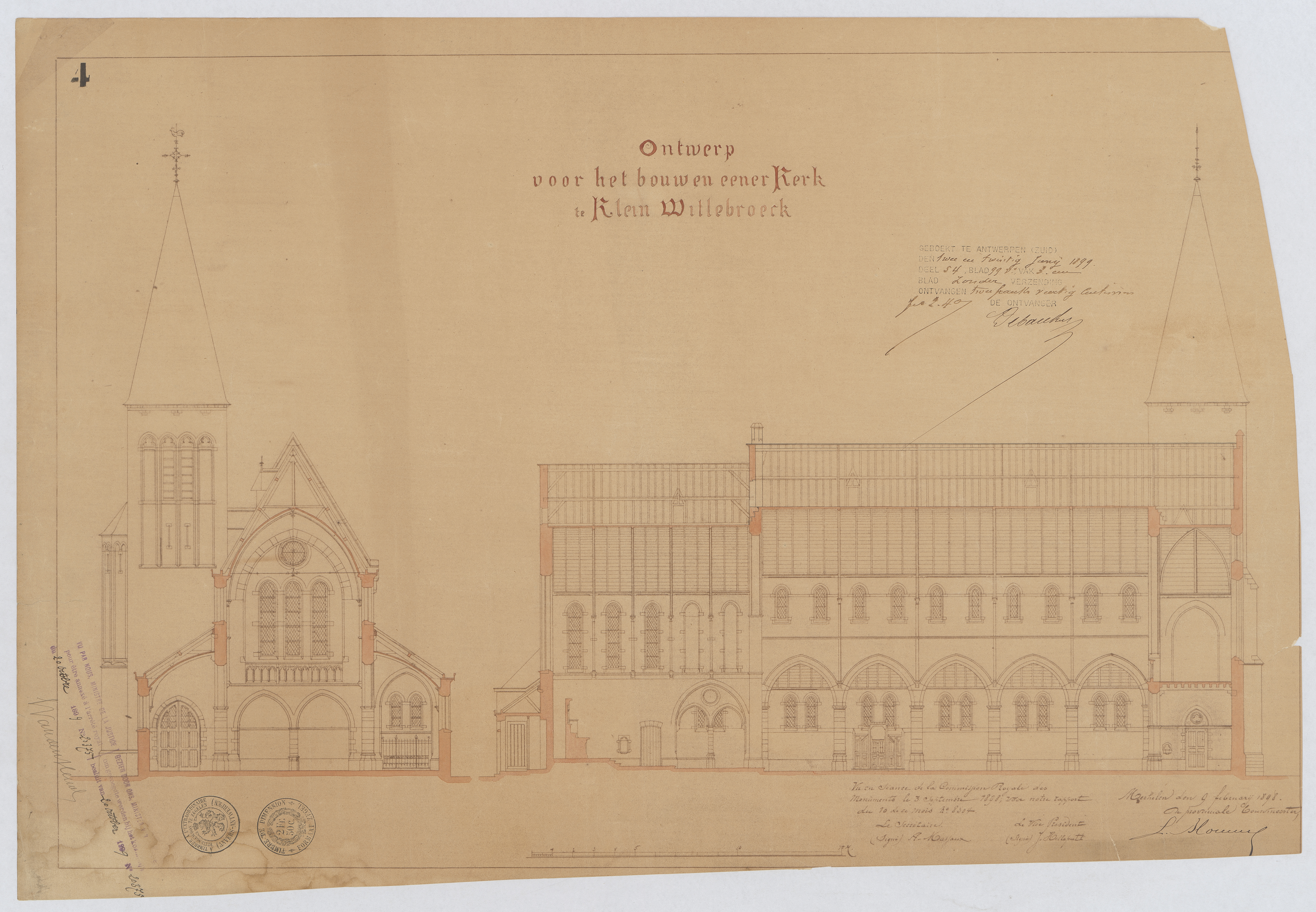 Opschrift: Ontwerp voor het bouwen eener Kerk te Klein Willebroeck. Omschrijving plan: dwarsdoorsnede, langsdoorsnede Datum KCML: 3 /09/1898 Archiefnummer: A1307