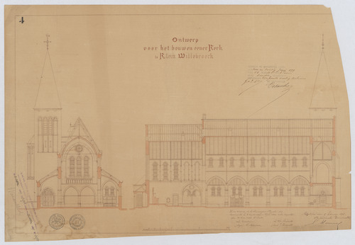 Opschrift: Ontwerp voor het bouwen eener Kerk te Klein Willebroeck. Omschrijving plan: dwarsdoorsnede, langsdoorsnede Datum KCML: 3 /09/1898 Archiefnummer: A1307