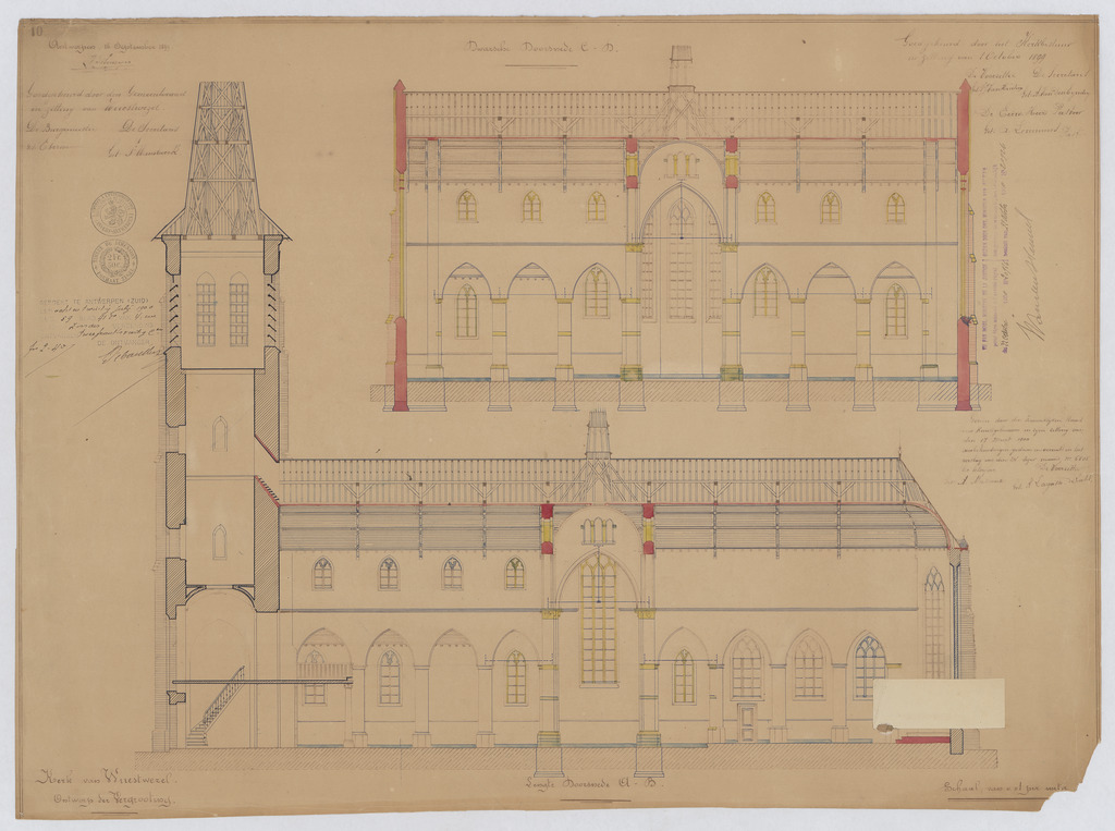 Opschrift: Kerk van Wuestwezel. Ontwerp der Vergrooting. Omschrijving plan: langsdoorsnede, dwarsdoorsnede over kruisbeuk Datum KCML: 17/03/1900 Archiefnummer: A1323_02