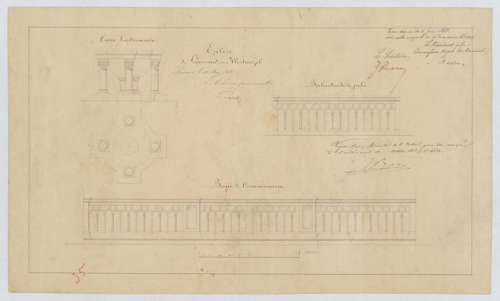 Opschrift: Eglise de Gooreind sous Westwezel. Chaire à prècher. Omschrijving plan: plattegrond en aanzicht doopvont, aanzicht communiebank, aanzicht balustrade doksaal Datum KCML: 17/03/1900 Archiefnummer: A1328