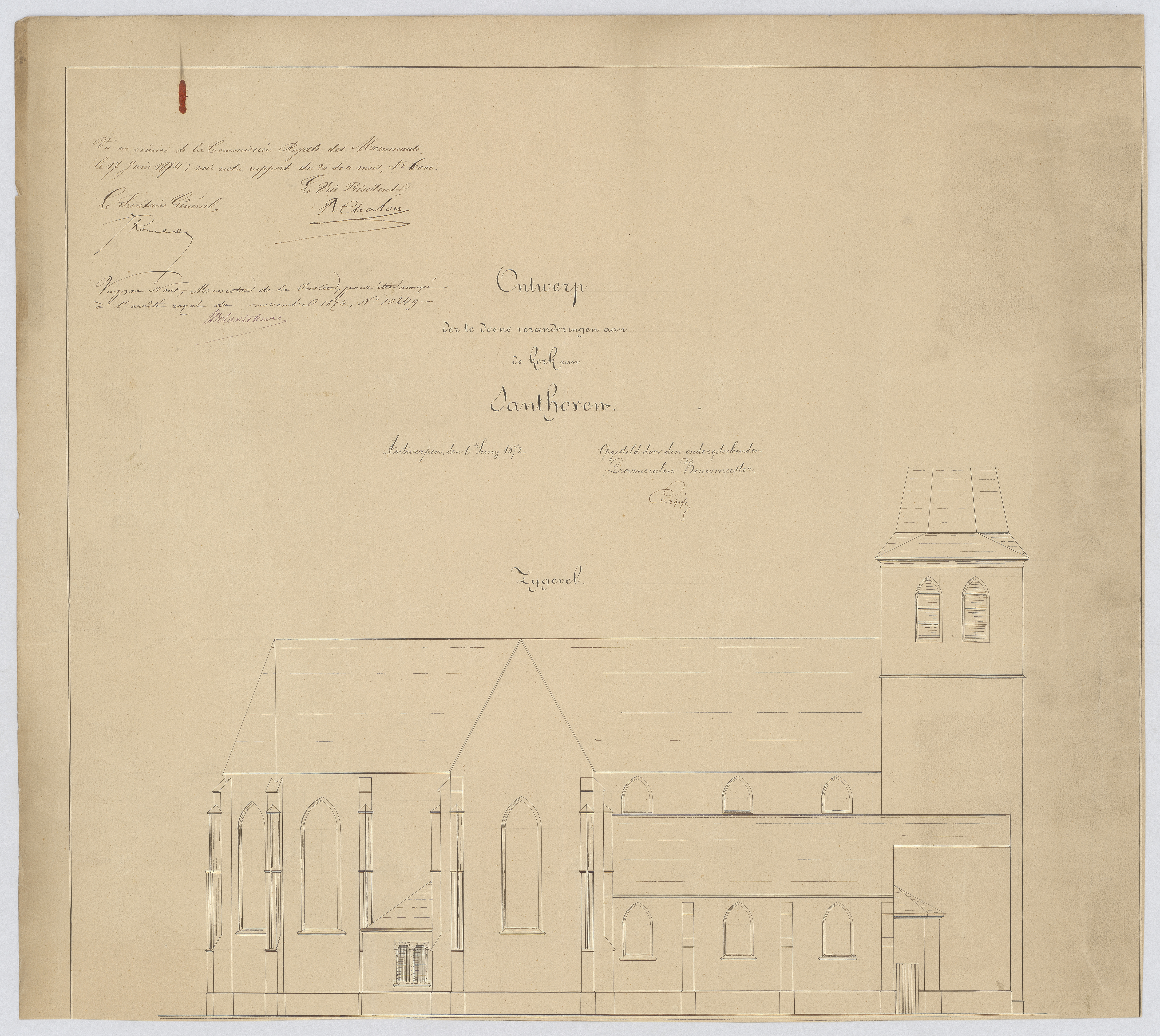 Opschrift: Ontwerp der te doene veranderingen aan de kerk van Santhoven. Omschrijving plan: opstand zijgevel 1 Datum KCML: 17/06/1874 Archiefnummer: A1335