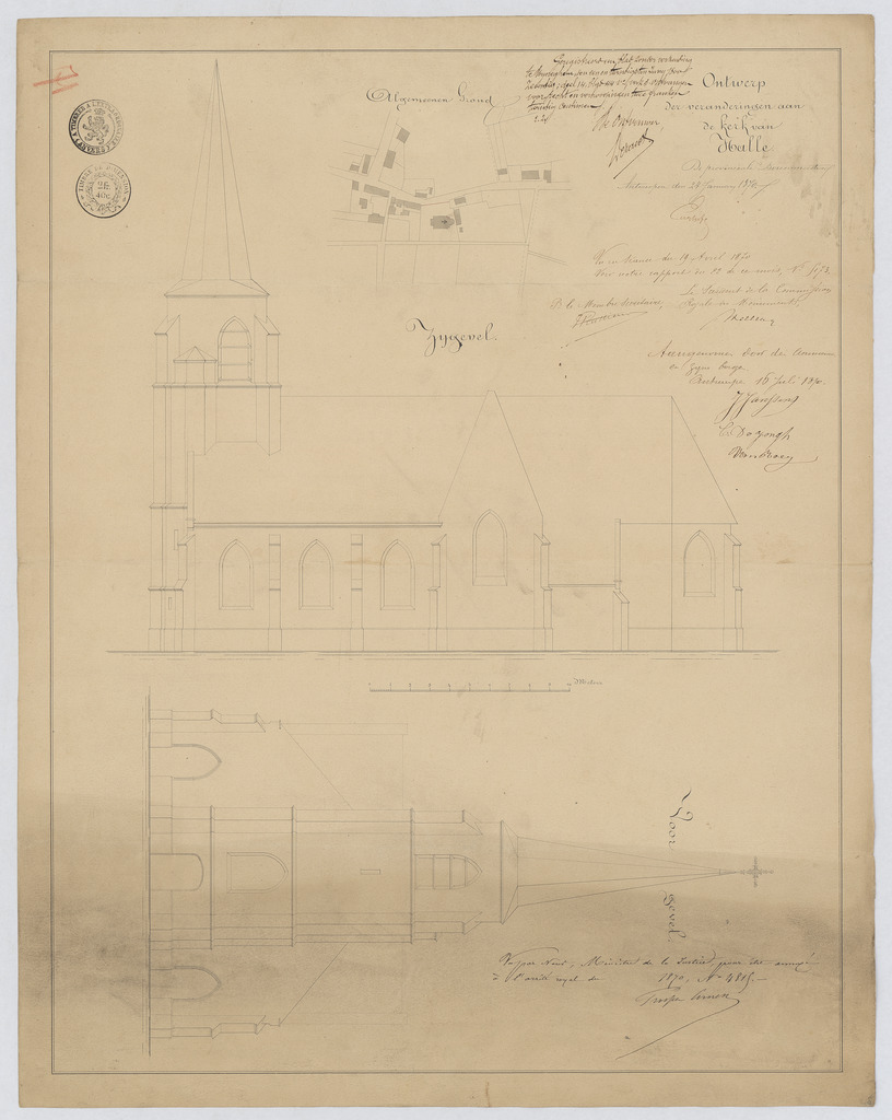 Opschrift: Ontwerp der veranderingen aan de kerk van Halle. Omschrijving plan: opstand voorgevel, opstand zijgevel, situatieplan Datum KCML: 19/04/1870 Archiefnummer: A1346