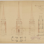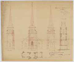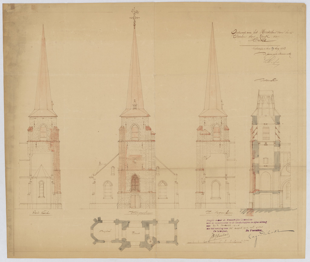 Opschrift: Ontwerp voor het Herstellen van de Toren der Kerk van Halle. Omschrijving plan: opstand voorgevel, opstand noord- en zuidgevel toren, plattegrond toren, doorsnede toren Datum KCML: 24/03/1914 Archiefnummer: A1352