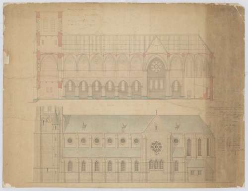 Opschrift: Ontwerp voor het bouwen eener Kerk te Zwijndrecht. Omschrijving plan: opstand zijgevel 1, langsdoorsnede Datum KCML: 31/08/1901 Archiefnummer: A1361