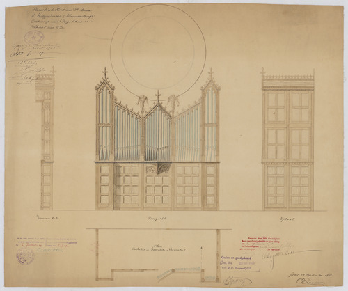 Opschrift: Parochiale kerk van St. Anna te Zwijndrecht (Vlaamsch Hoofd). Ontwerp van Orgelkas. Omschrijving plan: plattegrond,voor- en zijaanzicht en doorsnede orgelkast Datum KCML: 17/10/1908 Archiefnummer: A1370