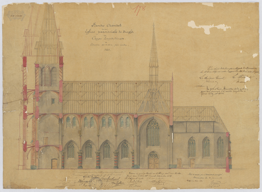 Opschrift: Flandre Orientale. Eglise paroissiale de Burght. Coupe longitudinale. Omschrijving plan: langsdoorsnede Datum KCML: 8 /06/1887 Archiefnummer: A1386
