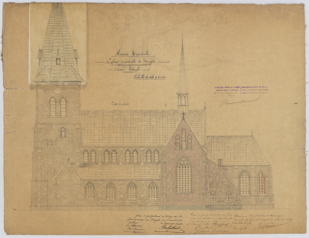Opschrift: Flandre Orientale. Eglise paroissiale de Burght. Façade latérale. Omschrijving plan: opstand zijgevel 1 Datum KCML: 12/11/1902 Archiefnummer: A1390