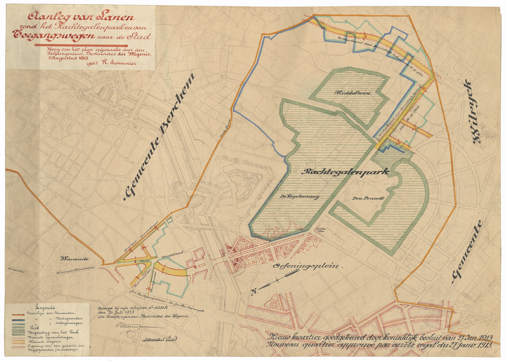 Opschrift: Aanleg van lanen rond het Nachtegalenpark van toegangswegen naar de stad. Nieuw kwartier goedgekeurd door koninklijk besluit van 27 jan. 1913. Nouveau quartier approuvé par arrète royal du 27 jan. 1913. Omschrijving plan: stedenbouwkundig ontwerp Datum KCML: deze informatie wordt niet vermeld op het archiefstuk Archiefnummer: A1402