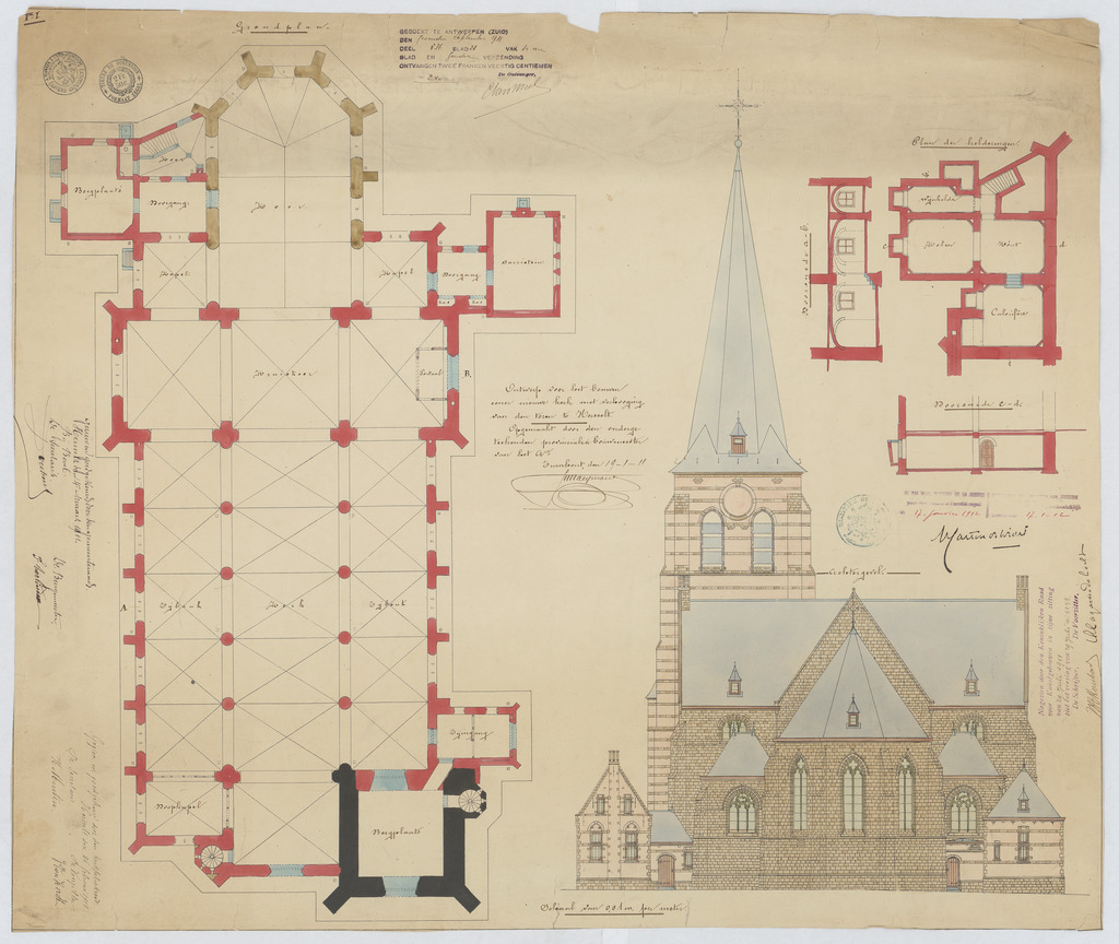 Opschrift: Ontwerp voor het bouwen eener nieuwe kerk met verhooging van den toren te Herselt. Omschrijving plan: plattegrond niveau 0, opstand achtergevel, plattegrond niveau -1, doorsneden Datum KCML: 29/07/1911 Archiefnummer: A0774