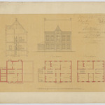 Opschrift: Provincie Antwerpen. Arrondissement Mechelen. Ontwerp voor het bouwen eener Pastorij te Goor onder Heyst-op-den berg. Omschrijving plan: opstand voorgevel, plattegrond niveau -1, plattegrond niveau 0, plattegrond niveau 1, doorsnede Datum KCML: 3 /03/1875 Archiefnummer: A0732