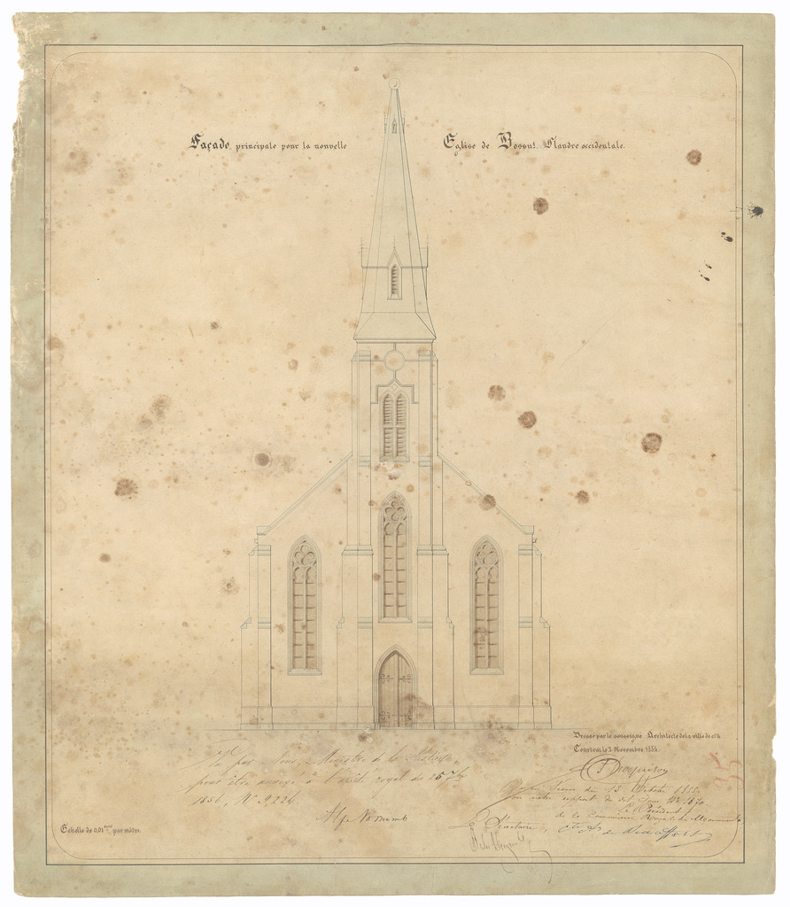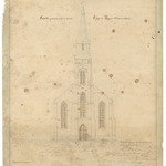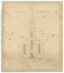 Opschrift: Facade principale pour la nouvelle Eglise de Bossut. Fl. occidte. Omschrijving plan: opstand voorgevel Datum KCML: 13/10/1855 Archiefnummer: W0060