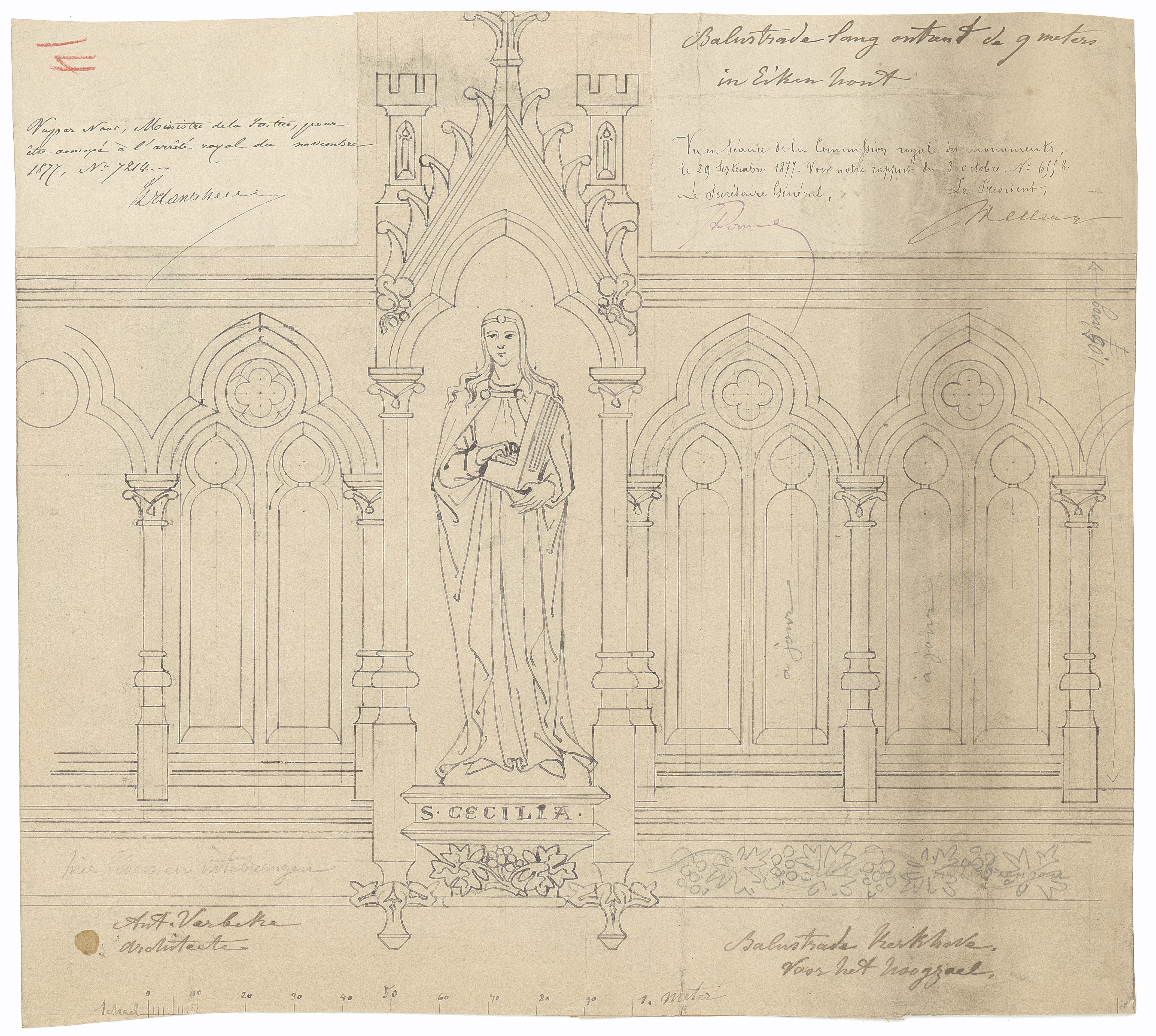 Opschrift: Balustrade Kerkhove voor het hoogzael Omschrijving plan: ontwerp balustrade hoogzaal Datum KCML: 29/09/1877 Archiefnummer: W0075