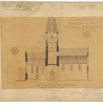 Opschrift: Provincie West-Vlaanderen. Gemeente Waermaerde, Ontwerp tot vergrooting en herstelling der parochiale kerk. Omschrijving plan: langsdoorsnede (aangepast ontwerp) Datum KCML: 11/03/1899 Archiefnummer: W0096_02