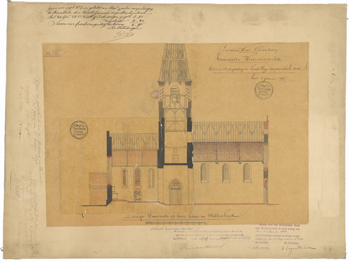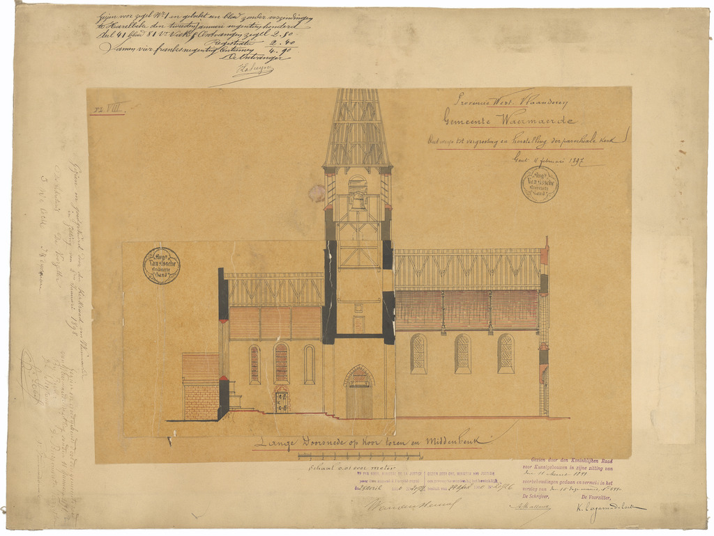 Opschrift: Provincie West-Vlaanderen. Gemeente Waermaerde, Ontwerp tot vergrooting en herstelling der parochiale kerk. Omschrijving plan: langsdoorsnede (aangepast ontwerp) Datum KCML: 11/03/1899 Archiefnummer: W0096_02