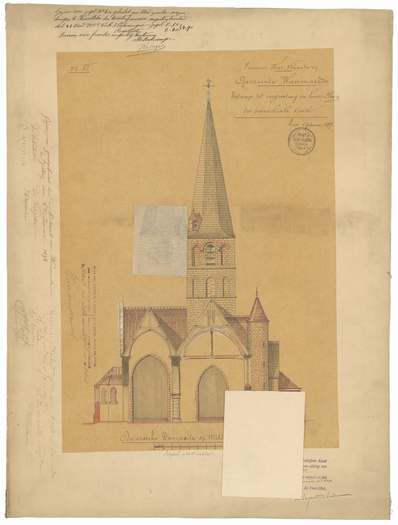 Opschrift: Provincie West-Vlaanderen. Gemeente Waermaerde, Ontwerp tot herstelling en vergrooting der parochiale kerk. Omschrijving plan: dwarsdoorsnede Datum KCML: 11/03/1899 Archiefnummer: W0094_02a