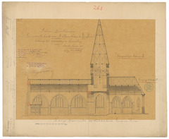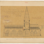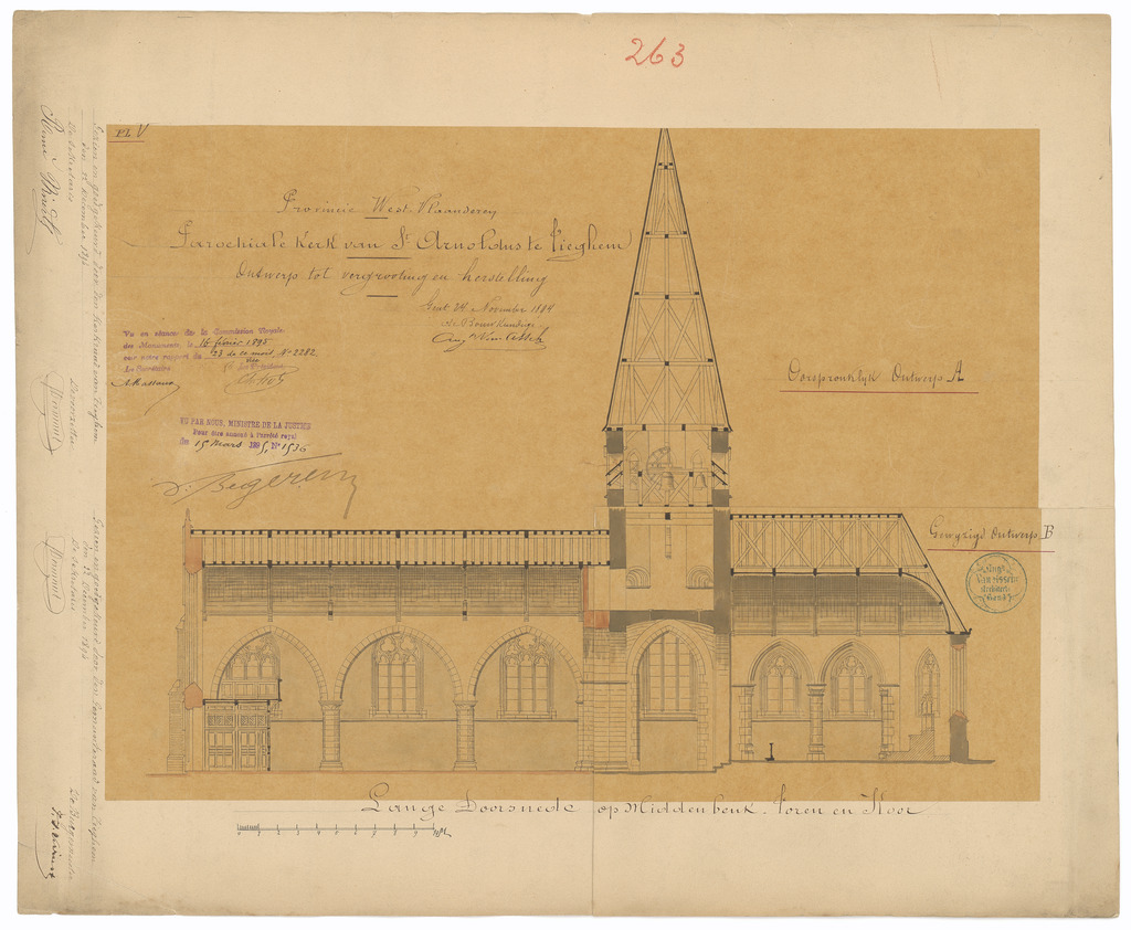 Opschrift: Provincie West-Vlaanderen. Parochiale Kerk van St.Arnoldus te Tieghem. Ontwerp tot vergrooting & herstelling. Omschrijving plan: langsdoorsnede (aangepast ontwerp) Datum KCML: 16/02/1895 Archiefnummer: W0029_01